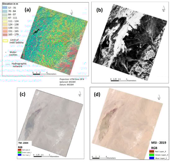 A 30-m spatial resolution digital elevation model (DEM) was obtained from the Advanced Spaceborne Thermal Emission and Reflection Radiometer (ASTER) database and prepared in Geographic Information System (GIS). This model requires several measures, such as gap filling, spatial sorting, and subset analysis of the extracted region (Figure 3a). The radar Sentinel-1 C-band Level-1 ground range-detected (GRD) images were collected at a 10-m spatial resolution (Figure 3b). The Thematic Mapper (TM)/Landsat-5 (Figure 3c) and Sentinel-2 MSI are shown in Figure 3d. The Landsat-5 TM images were acquired on 2 June 1984, 6 August 1994, and 21 April 2004, whereas the Sentinel-2 MSI images were acquired on 16 April 2017 and 10 April 2019. The spatial resolution of the Landsat images was 30 m, whereas that of the Sentinel-2 images was 10 m. The materials were provided in ground range and georeferenced in the UTM, Universal Transverse Mercator coordinate system (WGS84 zone 28N projection), which was the same projection of the DEM Aster, TM Landsat-5, MSI Sentinel-2, and SAR (GRD) Sentinel-1 images.