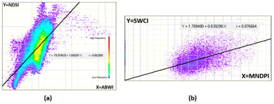 We also drew a scatter plot (Figure 4a) to analyze the spectral space generated by the indices ABWI and NDSI. After evaluating the statistical regression results, we found that ABWI and NDSI had a positive linear correlation: 10. The equation for the regression is