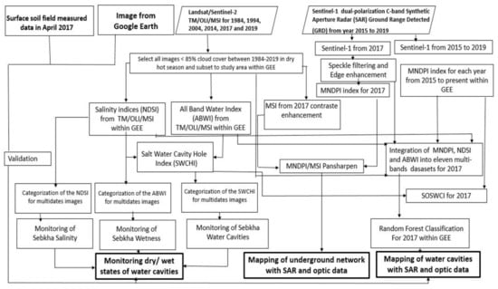 Figure 5 presents an overview of the key methodological measures used in the analysis. Firstly, we preprocessed satellite reflectance datasets in GEE to extract and monitor the water (ABWI) and salinity (NDSI) indices from 1984 to 2019 for every 10 years. Secondly, we defined a new index for water cavities signal detection by studying the correlation between the salinity and water indices. This new index measured the cavity presence signal filled with saltwater, which we called SWCI, and monitored the presence or absence of saltwater in the studied cavities from 1984 to present. Thirdly, we extracted a soil moisture index (MNDPI) in GEE from dual-polarization C-band SAR Sentinel-1 to monitor surface wetness from 2015 to present. This polarimetric index showed a high correlation with the optical SWCI, thereby allowing us to define another index called SOSWCI that combined the dielectric properties with the spectral properties. SOSWCI was applied only for the optical and radar images obtained in April 2017, which corresponded to the date of collecting the in-situ data used for the validation. These images were also used to merge passive and active radiometric data into one image, which we used to explore the hydrologic operation mode of Imlili Sebkha. The last image was used in the nonparametric classification process with RF as a decision rule.