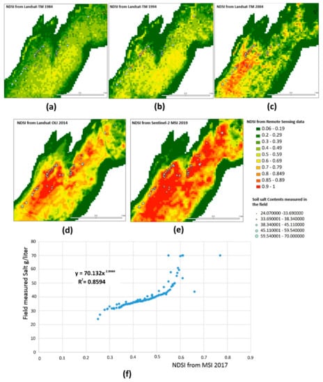 Monitoring of NDSI from 1984 to 2019 (a–e) spatial distribution and soil salinization measured in the field, and (f) correlation between NDSI from Sentinel-2 MSI 2017 and the salt content field measurements.