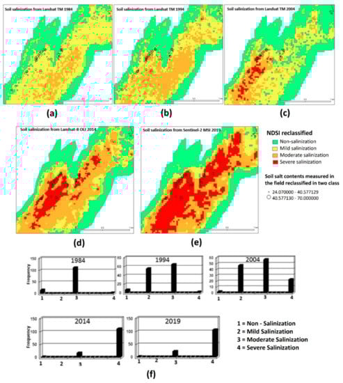 (a–e) Soil salinization spatial class distribution from 1984 to 2019 versus the soil salt measured in the field and reclassified into two classes, and (f) salinization states of the saltwater cavities extracted from the classified NDSI.