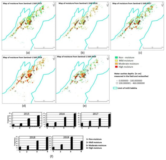 (a–e) Moisture map obtained from the reclassification of the MNDPI signal into four classes from non-moisture to high moisture of the water holes from 2015 to 2019 versus the depth of the saltwater cavities measured in the field and reclassified into two classes, and (f) moisture state statistics of the saltwater cavities extracted from MNDPI.
