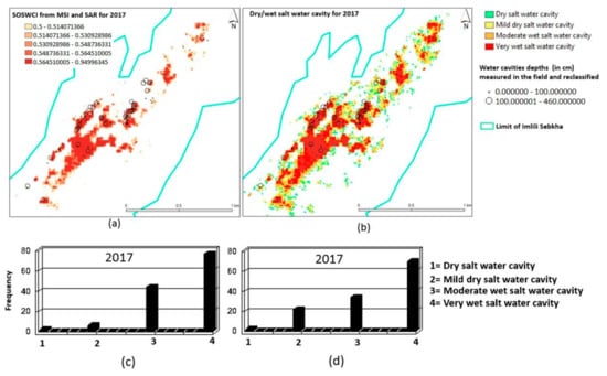 (a) The Sar/Optic Saltwater Cavity Index (SOSWCI) signal reclassified into five classes from 2017 versus the depth of saltwater cavities measured in the field and reclassified into two classes; (b) dry/wet states of saltwater cavities for 2017, wet/dry states statistics of saltwater cavities; (c) data extracted from the classified SOSWCI for 2017; (d) data measured in the field for the same year and reclassified into four classes.