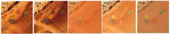 The soil moisture information from Imlili Sebkha was evaluated by calculating the MNDPI index from the Sentinel-1 SAR C-band Level-1 GRD image for 2015 to 2019. The spatial and temporal soil moisture patterns from the MNDPI signal were analysed. The moisture map was generated by reclassifying the MNDPI signal into four classes (Figure 9a–e), and the moisture statistics of the saltwater cavities were extracted (Figure 9f). The results obtained from the radar images were highly precise because the radar signal was highly sensitive to the ground geomorphology. Near the water cavities, the radar managed to detect a micro relief as denoted by the red dots in Figure 9a–e. Moreover, the MNDPI index showed high sensitivity to humidity as indicated by its maximum signal at the water cavities. These two factors improved the radar detection efficiency of water cavities, thereby making our results more accurate than those obtained by optical sensors. We also observed a similar moisture behaviour from 2015 to 2018, but in 2019 we observed a significant decrease in the wettest wells (Figure 9f).