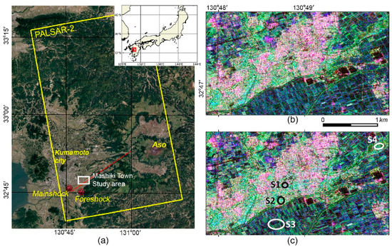 (a) ALOS-2 PALSAR-2 data coverage (yellow rectangle) and location of the Mashiki Town study area (white rectangle) marked on the Google Earth, and PALSAR-2 images (red: HH; green: HV; blue: VV) of the study area acquired (b) before (3 December 2015) and (c) after (21 April 2016) the earthquake. Locations of the foreshock and mainshock of the 2016 Kumamoto earthquake are also marked in (a). The red dashed line in (a) illustrates the approximated location of the Futagawa fault where the major damages are distributed. Four regions of interest (S1: collapsed buildings; S2: intact buildings; S3: intact croplands; and S4: intact forests) are indicated in (c).