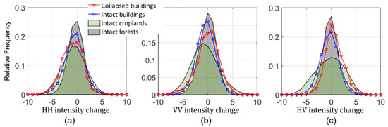 In the monostatic backscattering case, when by the scattering reciprocity, we have two co-polarization differences ( and ) and one cross-polarization difference () to characterize possible changes in the ground scatterers. Figure 2 shows the histogram of , , and for the selected regions of interest. The HH power is slightly reduced by the collapse of buildings and the VV power is slightly increased. However, it can be seen that and in the damaged areas are not distinct compared to other natural changes, particularly in croplands. The scattering power changes in intact areas are more noticeable in the cross-polarization channel, and therefore it is difficult to highlight the damaged areas using .
