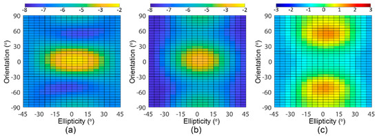 The scattering matrix observation allows the characterization of scatterers not only for the H and V polarization states but also for any polarization basis through a unitary transformation [13]. Therefore, we can exploit backscattering intensities for different combinations of transmit/receive polarization states, named the polarization synthesis [14], which can better distinguish damaged areas. The polarization states of a wave can be characterized by the orientation and the ellipticity angles. The ellipticity angle corresponds to linear polarization states (e.g., H-polarization with and V-polarization with ). The ellipticity of and correspond to left circular (L) and right circular (R) polarization states, respectively. The polarization response plot [14] represents variation in scattering powers as a function of the orientation and ellipticity angles of the transmitted wave. Among the possible selection of the receiver polarization, co-polarization configuration, i.e., the transmitting and receiving antennas have the same polarization state, was considered in this study. Based on the scattering matrix observation, the co-polarization response can defined by [13]: