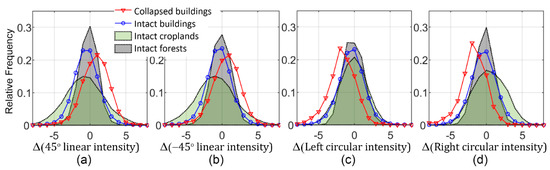 Figure 3 shows averaged obtained at pre- and post-earthquake conditions for building-damaged areas. The at the pre-earthquake condition shows two minimum values at linear polarization oriented at (-linear) and maximum value at H polarization states. After the earthquake, the co-polarization response is changed, and the magnitude of scattering power changes can vary depending on the polarization states. According to the changes of co-polarization response shown in Figure 3c, the maximum increase and decrease of co-polarization response can be obtained at -linear and circular polarization states, respectively. Figure 4 shows the histogram of at -linear polarization states, and left and right circular polarization states for all selected regions of interest. It is seen that scattering power changes represented at -linear and circular polarization states can better separate collapsed buildings from other natural changes than the H–V basis cases shown in Figure 2.