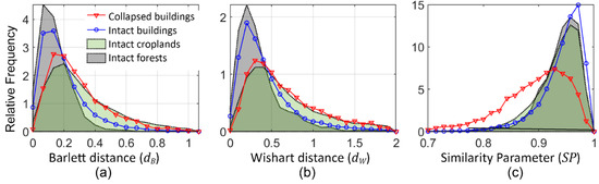 Figure 5 shows the histogram of dissimilarity measures , , and for the selected regions of interest. It is seen that the statistical distances between temporal covariance matrices ( and ) increase in areas where buildings were collapsed by the earthquake, but the increase of distances can be also observed by natural variations in croplands. On the other hand, the correlation-based dissimilarity measure shows significantly different values for collapsed buildings in comparison with those in other intact areas. One of the differences between the two types of dissimilarity measures is that the correlation-based measure is invariant to arbitrary scaling of the coherency matrix. Therefore, highlights temporal changes of polarimetric information regardless of the corresponding differences in overall amplitudes. The results shown in Figure 5 indicate that it is important to measure changes in the scattering mechanisms rather than the scattering amplitudes for effectively highlighting earthquake-induced changes.