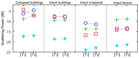 Figure 6 shows averaged , , , and scattering powers estimated from the coherency matrices and for the selected regions of interest. In the S1 site, the dominant scattering mechanism in the pre-earthquake condition is the double-bounce scattering followed by the surface and volume scattering components. Under the condition after the collapse of buildings in this area, the double-bounce component is reduced significantly while other scattering mechanisms are relatively increased. Changes in scattering components can be also observed in other non-damaged regions. However, no significant change in the double-bounce scattering contribution is found, as in the damaged areas. Consequently, the double-bounce scattering component of the scattering power decomposition can be used as an indicator for detecting the damaged areas.