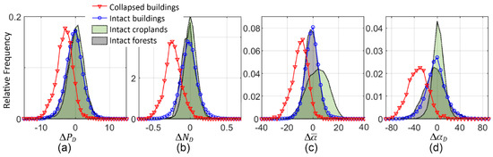 Figure 7 shows the histogram of scattering mechanism indicators , , , and for the selected regions of interest. Compared with statistical distance and matrix similarity measures, all proposed parameters indicating variations of scattering mechanisms can better separate collapsed buildings from other intact areas. Selected scattering mechanism parameters commonly indicate a significant reduction of the double-bounce scattering mechanisms in damaged areas, while there are no apparent changes in scattering mechanisms in other areas.