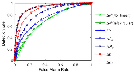 In order to compare detectability of different polarimetric change indicators independently of the detection methods, the ROC (receiver operating characteristic) analysis is carried out as shown in Figure 8. The ROC curve can be constructed by plotting the detection rate against the false-alarm rate at various thresholds. Given a threshold for a change indicator, the detection rate is determined by the ratio of the pixels detected as the changed class out of all pixels in the S1 site. The false-alarm rate is calculated similarly by the ratio of the pixels classified as the unchanged class out of all undamaged sites S2, S3, and S4.