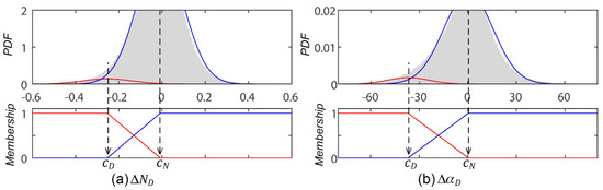 One possible way to solve this vagueness of decision boundary between damaged and undamaged classes is to use the fuzzy set theory [30]. The damaged class and the undamaged class can be considered as the fuzzy set. Each element in the observation space can be defined by the membership grades to class , i.e., . In order to apply fuzzy concepts to our detection problem, it is essential to determine the membership grades of each damage-highlight parameter or , such as and .