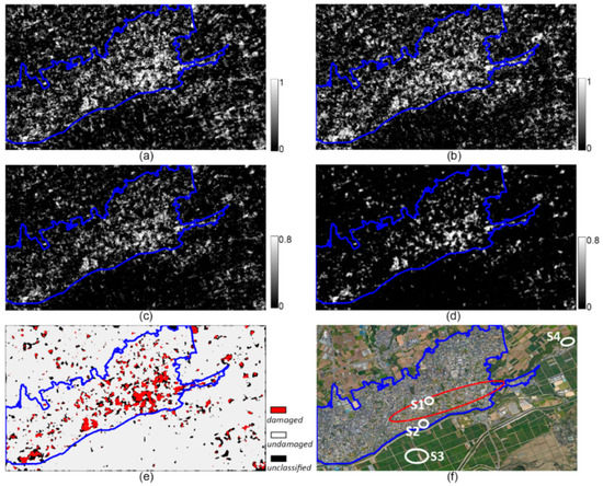 Figure 11 shows the calculated -factor in comparison with one of the proposed change indicators, . While the polarimetric parameter highlights building-damaged areas in urban areas, the single-polarization -factor enhances both natural background changes and building damages. If we limit the detection problem to the blue-outlined urban area, the -factor can provide meaningful information about the building damages. Therefore, it is possible to use the single-polarization damage detector if the urban areas are extracted before applying it. If appropriate information on urban areas is not available, there can be a significant number of false alarms in the detection results as an increase of temporal baseline between the two SAR acquisitions. On the other hand, the polarimetric damage indicators can effectively highlight the building-damaged areas, by tracking the damage-induced changes of the scattering mechanism.