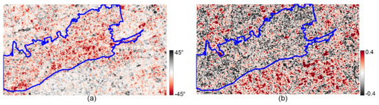 In order to emphasize the earthquake-induced variations in scattering mechanisms, two parameters corresponding to changes of the double-bounce scattering power () and the double-bounce scattering contribution among total received signals () can be defined as follows:
