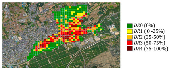 Most field investigations of damage to buildings have been carried out by a grid-based survey of damage degree of buildings. In the case of the 2016 Kumamoto earthquake, a field survey was carried by the Architectural Institute of Japan and the grid-based damage map was produced [33]. The damage status of buildings in each grid was visually inspected and categorized by Okada’s damage levels [34]. Figure 12 shows the grid-based damage map generated from the field survey report. The map shows the grid-based major damage rate (DR), which is the number of buildings belonging to major damage categories (damage levels 4 and 5) among the total number of buildings in each grid cell.