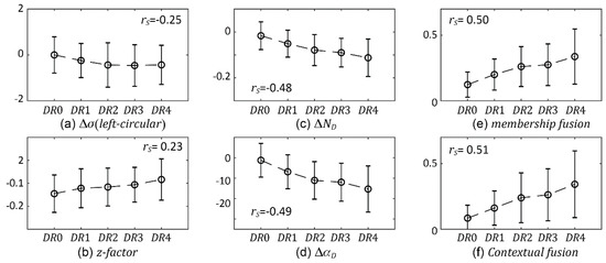 Figure 13 shows the grid-wise mean of the radar parameters with respect to the major damage rates. The Spearman’s rank correlation coefficient () is used to represent the correlation between the radar parameter and the survey result. Compared to the scattering-power-based change indicators, such as and -factor, the selected disaster indicators ( or ) show a higher correlation with the major damages assessed by the field survey. The fuzzy membership fusion can further increase the correlation between the SAR-derived damage index and the survey result. It is worth noting that the colors in the damage map are not the level of damages but the number density of the level-5 damaged buildings. On the other hand, the radar scattering parameter is a continuous random variable which may vary continuously depending on the degree of damage. In addition, due to the radar observation geometry and the structure of buildings, there can be a difference between the SAR pixel coordinate and the building footprint. Consequently, there are significant variabilities of grid-wise mean values of radar scattering parameters as the increase of the number of major damaged buildings in the survey grid-cell.