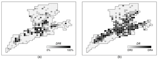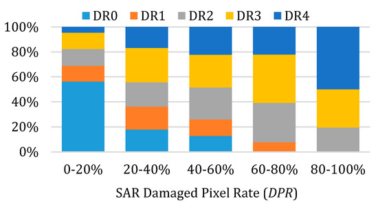(a) Damaged pixel rate (DPR) by synthetic aperture radar (SAR) data and (b) major damage rate (DR) by the field survey.