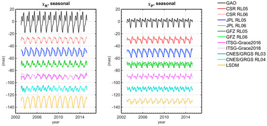 At this point, it should be reminded that both GRACE models and GAM (as well as GAO, which was computed after removing AAM and OAM from GAM) include barystatic sea level changes due to inflow of water from lands into the oceans (described by sea-level angular momentum SLAM). However, SLAM is not included in hydrological models that provide the data from lands only. Therefore, to make LSDM-based HAM more comparable with GAO and GRACE estimates, we added SLAM to it. The SLAM series considered here, available in the form of χ1, χ2, were based on ECMWF and LSDM data, and provided by the GFZ (ftp://esmdata.gfz-potsdam.de/../EAM/) [54,55]. Therefore, GAO, GRACE-based HAM, and LSDM-based HAM considered here should be consistent in the sense that each of them include SLAM. In the following, the HAM obtained from LSDM with SLAM added is simply called LSDM.