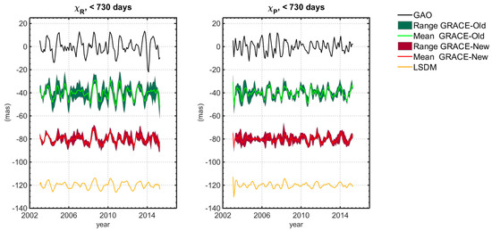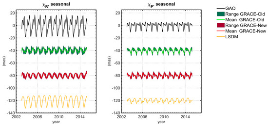 The χR and χP parts of non-seasonal oscillations in GAO and HAM are shown in Figure 3. The χR circular term in non-seasonal variation appeared to be stronger than the χP term for most of the old GRACE HAM series, as indicated by the STD values presented in Table A1. However, this was not apparent for GAO and HAM computed from the new GRACE solutions and the LSDM. The comparison of the mean χP and χR non-seasonal changes with ranges between minimum and maximum (Figure 4) showed that with the new GRACE RL06 solutions, different estimations of HAM were more similar; however, visible discrepancies were still present. Nevertheless, the HAM from the mean of all new GRACE solutions seemed to be more consistent with GAO and LSDM-based HAM than the HAM from any single GRACE solution.