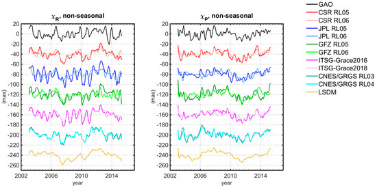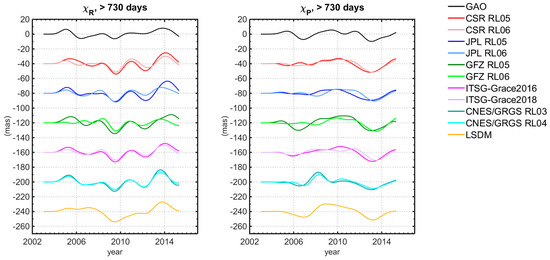 As an alternative to the use of hydrological models, PM excitation can be obtained from observations of temporal variations in the gravity field that are caused by changes in the Earth’s mass redistribution. Such data were provided by the Gravity Recovery and Climate Experiment (GRACE) mission between 2002 and 2017 [19]. The high-precision observations of global mass change are being continued thanks to the May 2018 launch of the successor of the mission, GRACE Follow-On. The so-called GRACE Level 2 data (or GRACE satellite-only model; GSM), having a form of spherical harmonics coefficients of Earth’s geopotential (or Stokes coefficients), can be used for designation of mass-related PM excitation. The variations of degree-2, order-1 coefficients (ΔC21, ΔS21) are proportional to the equatorial components (χ1, χ2) of the PM excitation [20]. After reducing GRACE-based excitations by tidal contributions (atmospheric tides, ocean tides, pole tides, and solid Earth tides), as well as non-tidal atmospheric and oceanic impacts, the remaining signal indicates the land hydrosphere effects with barystatic sea-level contributions [21] and earthquake signals [22] retained. Such PM excitation functions have been variously named in previous research: gravimetric excitation functions, gravimetric–hydrological excitation functions, GRACE-based HAM functions, or GSM-based angular momentum (GSMAM) functions.
