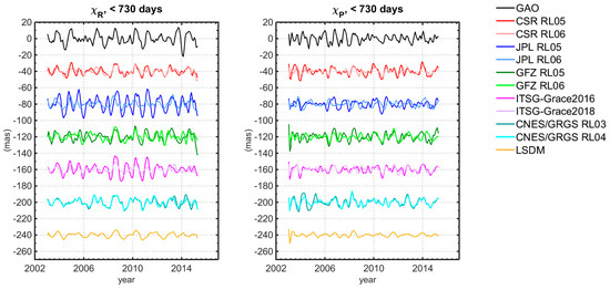 Recently, new GRACE solutions (RL06) have been developed and made available to the scientific community by the official GRACE data centres at the Center for Space Research (CSR) in Austin, USA; Jet Propulsion Laboratory (JPL) in Pasadena, USA; and GeoForschungsZentrum (GFZ) in Potsdam, Germany. However, at the same time, other data centres also joined the network, for example, Institute of Theoretical Geodesy and Satellite Geodesy (ITSG) of the Graz University of Technology in Austria released their ITSG-Grace2018 series, and the Centre National d’Etudes Spatiales/Groupe de Recherche de Géodésie Spatiale (CNES/GRGS) in France processed the CNES/GRGS RL04 solution. The first attempts to validate these solutions with respect to the observed PM excitation have been made in recent works [23,24,25]. These studies have all shown that both the consistency between particular solutions and the agreement with reference data have increased when applying the newly processed GRACE data. However, full agreement between GRACE-based and observed hydrological excitation has not yet been achieved.