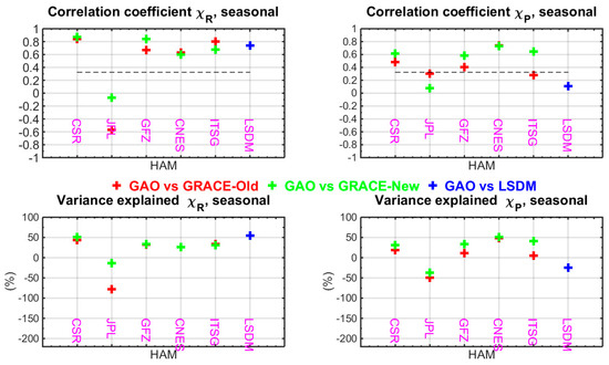 Correlation coefficients of χR and χP parts of seasonal variation between GAO and HAM computed from GRACE solutions and the LSDM and percentage of variance in GAO explained by HAM functions. The critical value of the correlation coefficient for 25 independent points and a confidence level of 0.95 was 0.34. The standard error of the difference between two correlation coefficients for 25 independent points was 0.30.