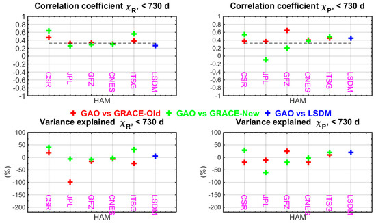 where means absolute values, is a mean correlation coefficient for all old GRACE solutions, is a mean relative explained variance for all old GRACE solutions, positive results indicate improvement, and negative results indicate deterioration. Table 5 and Table 6 were supplemented with values for the mean GRACE correlations and variances.
