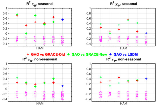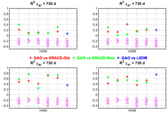 The χP and χR parts of long-term non-seasonal GAO and HAM are presented in Figure 7 and Figure 8. In general, comparison of new GRACE data with old data revealed that the amplitudes of longer oscillations changed less than those for shorter periods. The magnitude of HAM was affected only slightly for the JPL and GFZ solutions. Notably, HAM series computed from the LSDM revealed an overestimation in the amplitudes of observed PM excitation, whereas they visibly underestimated them in the case of shorter variations (Figure 5). Regardless of whether old or new GRACE data were used, for the χR term, GRACE-based HAM series were characterized by higher STD and bigger amplitudes than GAO. For the χP part of the oscillations, the STDs of HAM were more consistent with the STDs of the reference series. The small amplitude change obtained after updating GRACE models from RL05 to RL06 resulted in a small increase in consistency between different HAM estimations (Figure 8). Different GRACE solutions were revealed to be more consistent for the χR term than for the χP term.