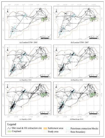 Classification results for expansion of dirt road and oil extraction infrastructure in 2005–2018: (a–b) Landsat ETM+ (15 m), (c–e) RapidEye (5 m), and (f) PlanetScope (3 m).