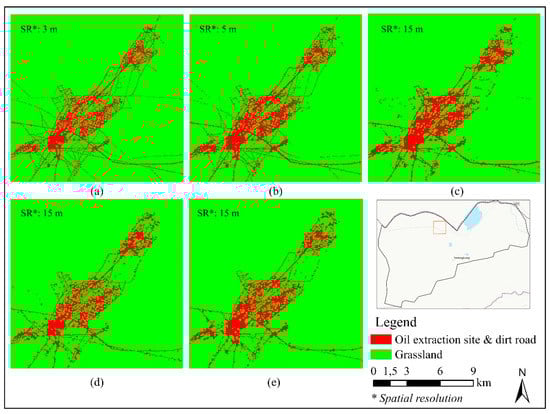 To analyze the dependence of the detection of linear features on spatial resolution, maps were compiled allowing a direct comparison. Figure 4 shows the classified result as dirt roads and oil extraction site, and grassland in the comparison plot of Menen Steppe in 2018. From the difference maps, minimum widths of feature were calculated which are required in relation to the spatial resolution in order to allow a reliable detection. For instance, PlanetScope (3 m) correctly detected linear features >6 m in width, while RapidEye (5 m) correctly detected >10 m wide. Landsat ETM+ (15 m) started to correctly detect linear features >25 m width as well as the spatially binned imagery of PlanetScope (15 m) and RapidEye (15 m). Consequently, a narrow linear feature of below 20 m in width was missed with Landsat ETM+ and all spatially binned imageries. Beside widths of features, their lengths also influenced the probability to be correctly classified. Consequently, narrow linear features below 20 m in widths were correctly classified based on Landsat 15 m data if they were long enough.