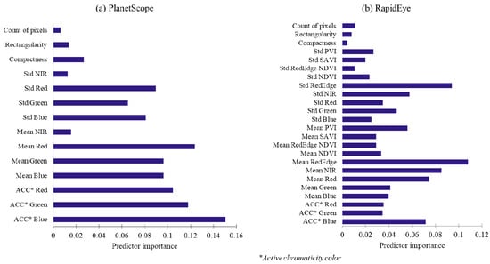Variable importance for linear feature classification. (a) PlanetScope and (b) RapidEye.