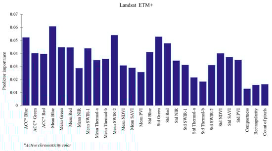 For the Landsat imagery, the predictor variables derived from visible light and short-wave infrared-2 spectral bands of Landsat ETM+ were among the most important variables for linear feature extraction (Figure 6). In particular, the variables of the blue and short-wave infrared-2 (SWIR 2) band had high importances compared to all other predictors.