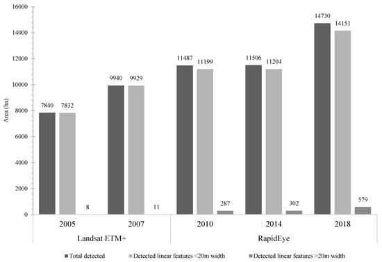 Areas with high road densities such as those where multiple parallel dirt road lanes exist, are commonly classified as the linear features in classification of RapidEye (5 m), Landsat ETM+ (15 m), and spatially binned imageries. This overlapping leads to an increase in the size of classified area because pixels between then different lanes are not counted as grasslands. Table 3 provides the total area represented by the class. The result of linear feature class in all original finer resolution imageries was quite similar among the different image sources. For instance, the total area of dirt road and oil extraction infrastructure site was 2532 ha for PlanetScope (3 m) and 2602 ha for RapidEye (5 m), while lower resolution Landsat ETM+ (15 m) detected 2806 ha. Linear feature class in spatially binned imageries varied considerably if compared to original imagery results. As expected, the total area of linear features decreased to 2393 ha for PlanetScope (15 m) and 2473 ha for RapidEye (15 m). Consequently, narrow linear features were missed.
