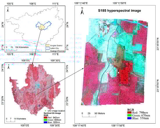 The study area is located in Xingbin District, Laibin City, Guangxi, China, East Asia (Figure 1). Laibin City is located between 108°24′–110°28′E and 23°16′–24°29′N, with mountains and hills accounting for 65%, and other areas are platforms and plains. It boasts a subtropical monsoon climate with warm weather, abundant rain and insignificant seasonal changes. Laibin City is rich in vegetation resources, which has the typical characteristics of complex planting structure, abnormal fragmented field parcels, terrain cutting in southern China. Different vegetation types show irregular and staggered distribution, which brings great difficulties to the fine classification of vegetation types. The main vegetation types in Laibin City are sugarcane, eucalyptus, citrus, etc. Laibin City is one of the key sugarcane production bases in China, taking the sugarcane production as the pillar industry. It has obvious advantages in planting fast-growing forests, and high-quality eucalyptus trees are widely planted. In addition, there are many kinds of horticultural crops in Laibin City, of which citrus is the most widely cultivated and distributed.