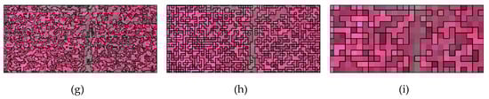 Local representation of secondary segmentation for multi-scale images: (a) 0.025 m (segmentation scale: 2500); (b) 0.05 m (segmentation scale: 1000); (c) 0.1 m (segmentation scale: 100); (d) 0.25 m (segmentation scale: 25); (e) 0.25 m (segmentation scale: 50); (f) 0.25 m (segmentation scale: 100); (g) 0.5 m (segmentation scale: 50); (h) 1 m (segmentation scale: 25); (i) 2.5 m (segmentation scale: 25).