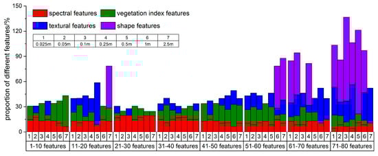 Finally, according to the importance from big to small, the final features were divided into 8 groups with 10 features in each group. The number of features for different feature types in each group was divided by the total number of this feature type. The results show that the proportion of different feature types in each group is different (Figure 5). In general, spectral features are distributed in all groups with little difference. The proportion of vegetation index features for multi-scale images in each group is quite different, which shows that the importance of vegetation index features increases as the spatial resolution decreases. Textural features are mainly distributed in the last 4 groups. In the first 4 groups, textural features are mainly distributed in images with high spatial resolution, while the textures in low-resolution images are not of sufficient importance. Shape features perform poorly in each scale image and are mainly distributed in the latter 3 groups. Compared to images with high spatial resolution, shape features in low-resolution images are enhanced. These results are consistent with previous studies [,,,]. In these studies, the spectral and vegetation index features make more significant contributions to the species classification of high spatial resolution images than the textural and shape features. Specifically, only a small percentage of texture or shape features are selected for classification. The majorities and most important features are spectral and vegetation index features.
