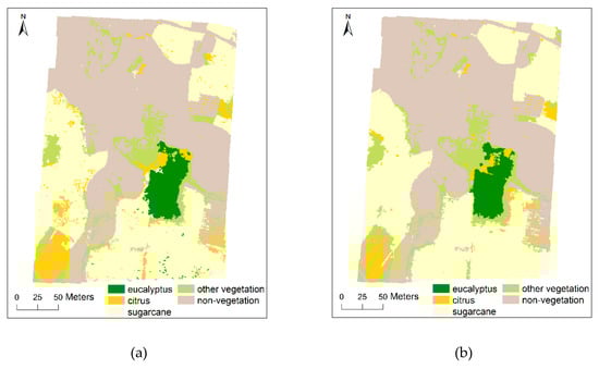 In this case study, the OA drops if the resolution is coarser than 0.25 m. With the decrease of spatial resolution, the number of mixed pixels increase continuously, and the edge of the parcels is more likely to increase commission and omission errors. This means that the spatial resolution should reach a certain threshold to achieve decent accuracy. However, same as previous cognition, the finer the spatial resolution is not the better [,]. For example, the accuracy of 0.025 m image is slightly lower than that of 0.05 m and 0.25 m. This makes sense, as vegetation has specific physical size, and spatial resolution significantly finer than the certain threshold may not help the classification performance. The image with centimeter-level resolution helps us not only to understand the detailed information of vegetation types but also significantly strengthens the phenomenon of same objects with different spectrum, bringing more interference to vegetation type identification. At the same time, the ultrahigh resolution has resulted in multiple increases in information, significantly reduces the efficiency of image processing. It means that there is no need to excessively pursue finer resolution than the threshold. A low-cost imager may be sufficient. Alternatively, the UAV can fly at higher altitude with larger coverage by sacrificing the spatial resolution, which is still sufficient for vegetation classification.