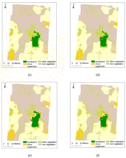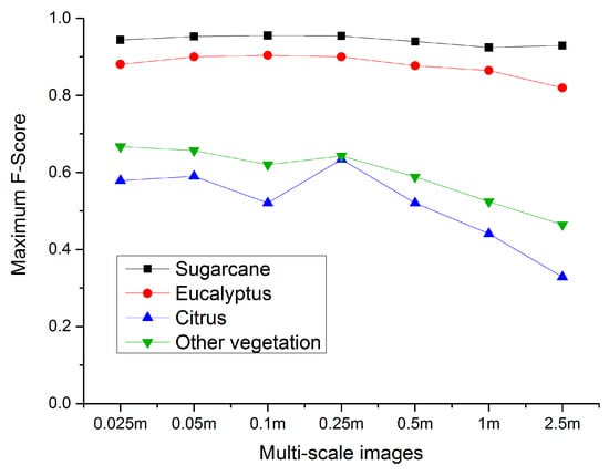 As shown in Figure 10 and Figure 11, the maximum F-score of sugarcane is the highest, reaching 92.4%–95.5% for multi-scale images. The 0.025–1 m images are not sensitive to the variation of feature numbers. The PA of sugarcane varies greatly with different feature numbers of the 2.5 m image, i.e., with the decrease of spatial resolution, the importance of feature selection increases. The maximum F-score of eucalyptus is between 82.0% and 90.4% in various scales. Except for the 2.5 m image, the variation of feature number has great influence on the identification of eucalyptus. The maximum F-score of citrus in each scale image is poorly. When 40 features of 0.25 m image participate in classification, the F-score reached the maximum, 63.39%. Then with the decrease of spatial resolution, the identification accuracy decreases greatly. The PA of citrus is relatively acceptable, while the UA performs terribly, which shows that as much citrus information as possible is extracted, while more non-citrus is identified as citrus. In addition, the variation of feature numbers has great influence on the accurate identification of citrus. Similar to citrus, the type of other vegetation receives low accuracy. When 30 features of 0.025 m image participated in classification, the F-score reached the maximum, 66.69%. Since the 0.25 m image, the identification accuracy gradually declines with the decrease of spatial resolution.