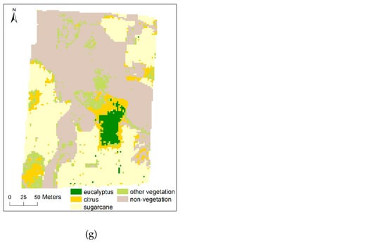 Classification results of the study area for multi-scale UAV images based on SVM classifier. The UAV image and the ground truth reference image of the study area are available in Figure 1 and Figure 2, respectively; (a) 0.025 m (segmentation scale: 2500, feature number: 40); (b) 0.05 m (segmentation scale: 1000, feature number: 30); (c) 0.1 m (segmentation scale: 100, feature number: 40); (d) 0.25 m (segmentation scale: 50, feature number: 30); (e) 0.5 m (segmentation scale: 50, feature number: 30); (f) 1 m (segmentation scale: 25, feature number: 30); (g) 2.5 m (segmentation scale: 25, feature number: 40).