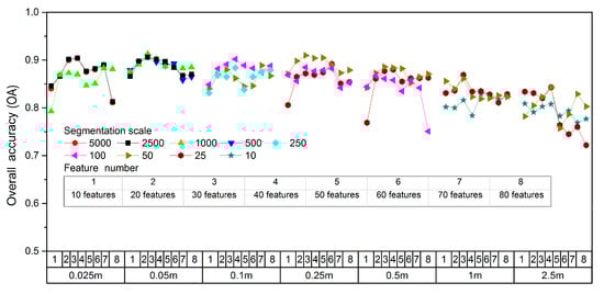 Overall accuracy (OA) of multi-scale images with different segmentation scales and feature numbers.