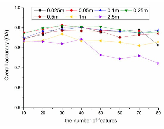Variation of overall accuracy (OA) under the condition of appropriate feature number and segmentation scale with different spatial scale.