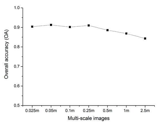 Figure 9 shows the OA variation under the condition of appropriate feature number and segmentation scale with different spatial scale by using SVM classifier. As the spatial resolution decreases, the OA shows a stable and slight fluctuation, and then gradually decreases. Among them, the accuracies of 0.025, 0.05, 0.1 and 0.25 m images showed little difference and reached more than 90%. The accuracy of 0.05 m image was the highest, reaching 91.3%, followed by 0.25 m image with an accuracy of 91.0%. Since the spatial resolution of 0.5 m, the OA gradually declined from 88.6% to 84.3% with the decrease of spatial resolution. The classification accuracy of images at various scales is consistent with previous studies. For example, Underwood used 4 m AVIRIS hyperspectral image, and the classification accuracy for six communities of three invasive species reaches 75% []. In Cao’s study, the classification accuracy for mangrove species based on 0.15, 0.3 and 0.5 m UAV hyperspectral images reach 88.66%, 86.57% and 82.69%, respectively [].