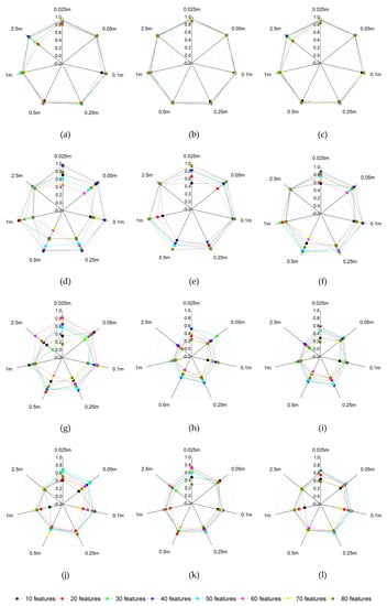 Identification accuracy variation of various vegetation types with image scales and feature numbers; (a) producer’s accuracy (PA) of sugarcane; (b) user’s accuracy (UA) of sugarcane; (c) F-Score of sugarcane; (d) PA of eucalyptus; (e) UA of eucalyptus; (f) F-Score of eucalyptus; (g) PA of citrus; (h) UA of citrus; (i) F-Score of citrus; (j) PA of other vegetation; (k) UA of other vegetation; (l) F-Score of other vegetation.