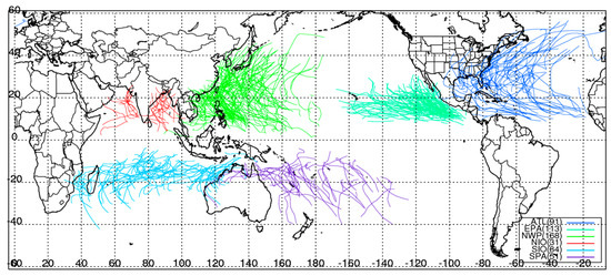 Positions and maximum sustained surface winds of TCs are reported every 6 h as part of the best-track datasets. Six TC-prone basins are considered in this study: Atlantic (ATL), eastern central Pacific (EPA), northwestern Pacific (NWP), northern Indian Ocean (NIO), southern Indian Ocean (SIO), and South Pacific (SPA). The best-track data of the ATL and EPA basins are obtained from the National Hurricane Center (NHC) [19]. For the other four basins, these data are taken from the U.S. Navy’s Joint Typhoon Warning Center (JTWC) (For Data details see the https://www.metoc.navy.mil/jtwc/jtwc.html?western-pacific). A total of 538 storms that reached tropical storm intensity levels or above were identified globally from 2011 to 2016 (Figure 1).