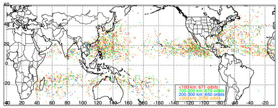 Geographic distribution of TC observations from 2011 to 2016 in the FY3B/MWRI TCsBT database. The number of orbits is provided in the legend.