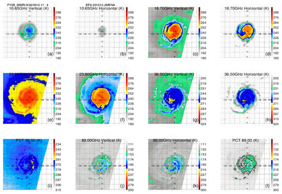 An example demonstration of hurricane Jimena MWRI TB in 30 Aug, 2015 produced from the FY-3B/MWRI TCsBT database for (a) 10.65 GHz vertical polarization, (b) 10.65 GHz horizontal polarization, (c) 18.70 GHz vertical polarization, (d) 18.70 GHz horizontal polarization, (e) 23.80 GHz vertical polarization, (f) 23.80 GHz horizontal polarization, (g) 36.50 GHz vertical polarization, (h) 36.50 GHz horizontal polarization, (i) PCT36.50 , (j) 89.00 GHz vertical polarization, (k) 89.00 GHz horizontal polarization, and (l) PCT89.00.