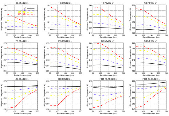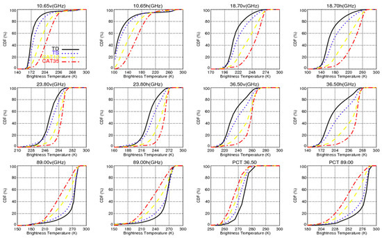 Figure 7 presents the cumulative distribution function (CDF) of TB’s of all channels and PCT36.50 and PCT89.00 over the 50–100 km annular region. For the 10.65, 18.70, 23.80, and 36.50 GHz channels, the stronger the TC intensity, the higher the TB values are. The higher TB values in these low- frequency channels are due to the radiation from the liquid water or water vapor emission from the TC inner core region. The higher the TC intensity, the stronger the inner core rain is, which is reflected in the CDF results. Conversely, the weaker the TC intensity, the higher the 89 GHz TB’s and PCT36.50 and PCT89.00. The 89.00 GHz TB’s, PCT36.50 and PCT89.00, are indicating the ice scattering signature in the inner core. The larger the amount of ice and the deeper the convection is in the inner, the lower the values are in these parameters. This results are consistent with many previous studies [8,18].