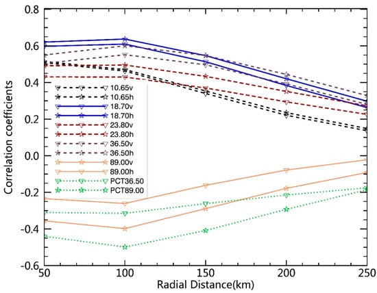 The 10.65 GHz mean polarized TB is positively correlated with Vmax, with the highest linear correlation coefficient at 0–50 km, and the linear correlation of horizontal polarization is better than vertical polarization. The mean polarization TBs of 18.70, 23.80, and 36.50 GHz are positively correlated with Vmax, and the linear correlation coefficient is highest in the 50–100 km annular region. The linear correlation coefficients of horizontal polarization are larger than those of vertical polarization. PCT36.50 and PCT89.00 are negatively correlated with Vmax. The negative linear correlation coefficient is highest in the 50–100 km annular area. The correlation between 89.00 GHz vertical polarization and Vmax is better than that of horizontal polarization. The correlation between PCT89.00 and Vmax is better than that of PCT36.50.