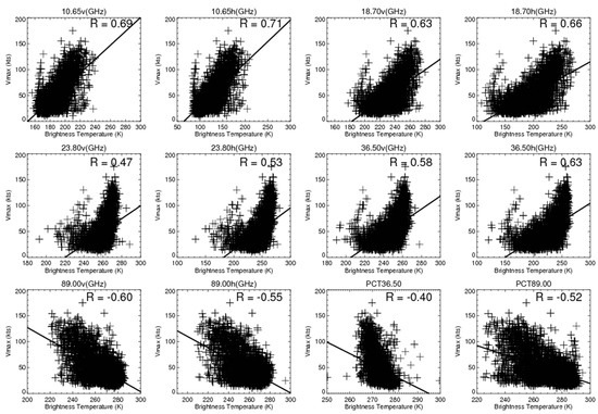 In this study, the stepwise regression method is used to select the optimal variables. Prior to the stepwise regression, the correlations between MWRI channels should be considered. Therefore, for the regression model, a correlation coefficient matrix among all the candidate variables (see Table 3) and correlation coefficients between MWRI channels TB and Vmax and the scatter plots within the 50–100 km annular region (see Figure 8) are calculated and reviewed to eliminate variables that are highly correlated with each other, and select the variables with the best correlation coefficients between MWRI TB and Vmax. Based on this principle, four variables (10.65h, 23.80v, 89.00v, and PCT36.50) are reserved for the TC intensity estimation model establishment. For the remaining variables, stepwise regressions using Interactive Data Language (IDL8.7.2, Linux x86_64 m64, (c) 2019, Harris Geospatial Solutions, Inc., US) International Mathematics and Statistics Library (IMSL) software are performed to further filter out variables with little contribution to the model. Based on the stepwise regression results, no variables can be removed. Therefore, 10.65h, 23.80v, 89.00v, and PCT36.50 are used as the estimators of TC intensity.